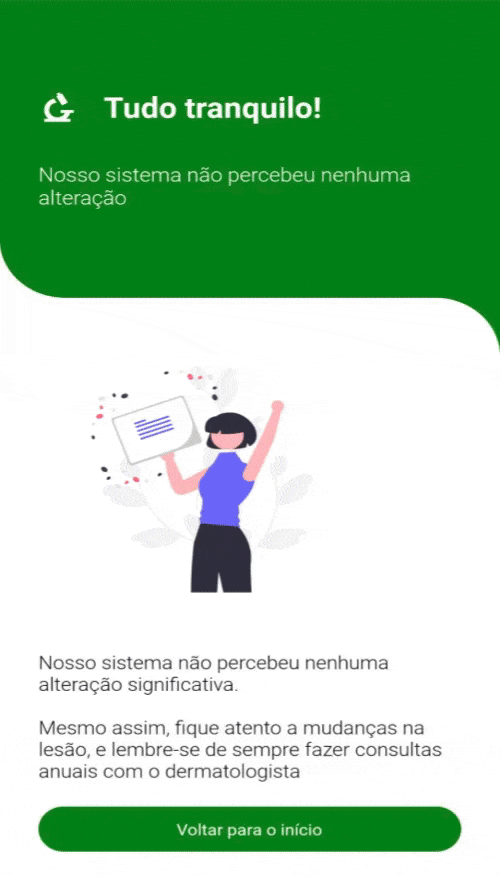 Nosso aplicativo auxilia na identificação precoce de possíveis lesões malignas de pele e coloca a avaliação inicial diretamente na mão do usuário. Qualquer pessoa usa a câmera do celular para capturar a imagem de uma lesão suspeita, como sinais, manchas ou marcas na pele, e o sistema classifica o nível de risco dessa lesão, oferecendo uma recomendação clara sobre a necessidade de procurar um dermatologista para avaliação profissional.