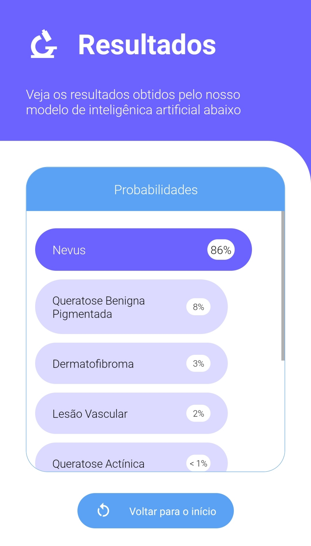 O aplicativo de classificação auxilia profissionais de atenção primária na triagem de lesões de pele e oferece suporte baseado em inteligência artificial para facilitar o encaminhamento de pacientes ao dermatologista. Com a ferramenta, o médico captura ou carrega uma imagem de uma lesão suspeita e recebe uma análise com as classes mais prováveis dessa lesão, o que torna a tomada de decisão sobre necessidade e urgência do encaminhamento mais objetiva e embasada.